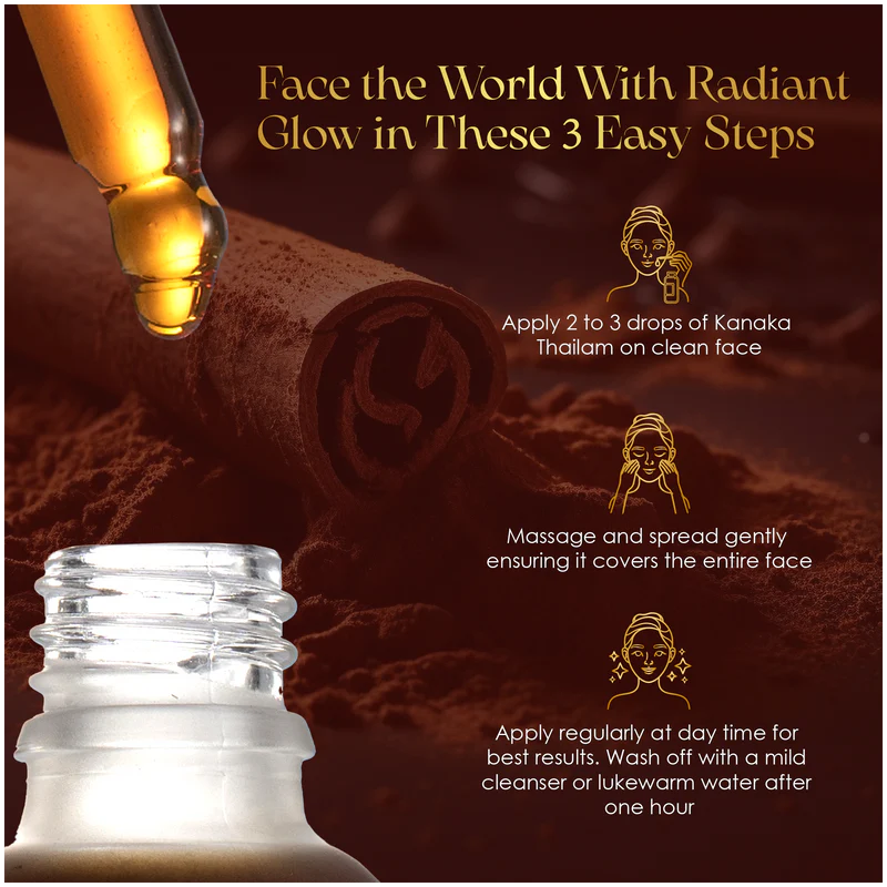O Kanaka Thailam é um sérum facial tradicional da Ayurveda, formulado com madeiras nobres e ervas clássicas para cuidar da pele de forma natural, profunda e contínua.