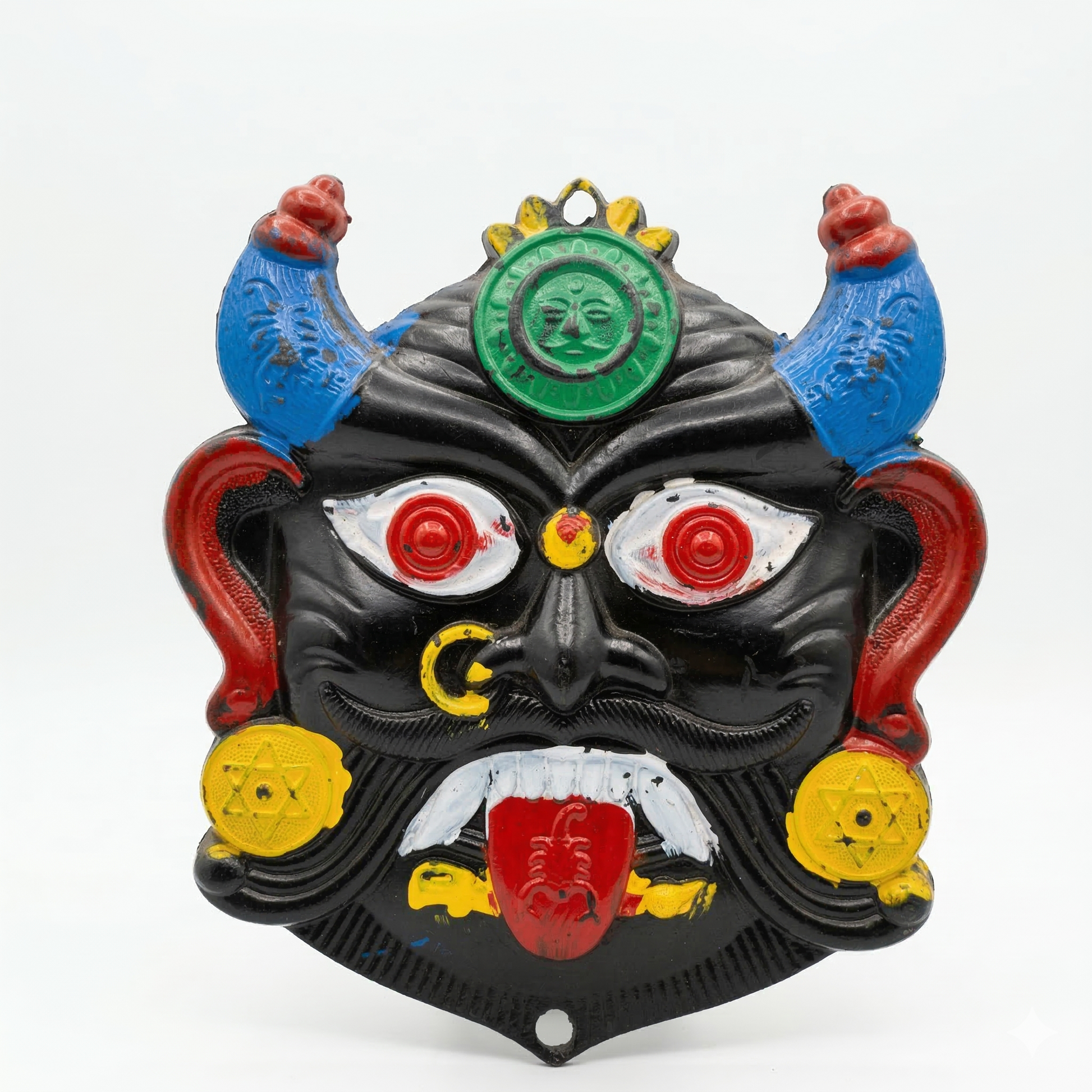 El Palaka (rostro protector Drishti) de tamaño mediano es una pieza tradicional que se coloca a la entrada de la casa para brindar protección energética. El Palaka actúa como un guardián simbólico, alejando el drishti (mal de ojo), las energías negativas y las influencias desfavorables, preservando así la integridad del hogar sagrado.