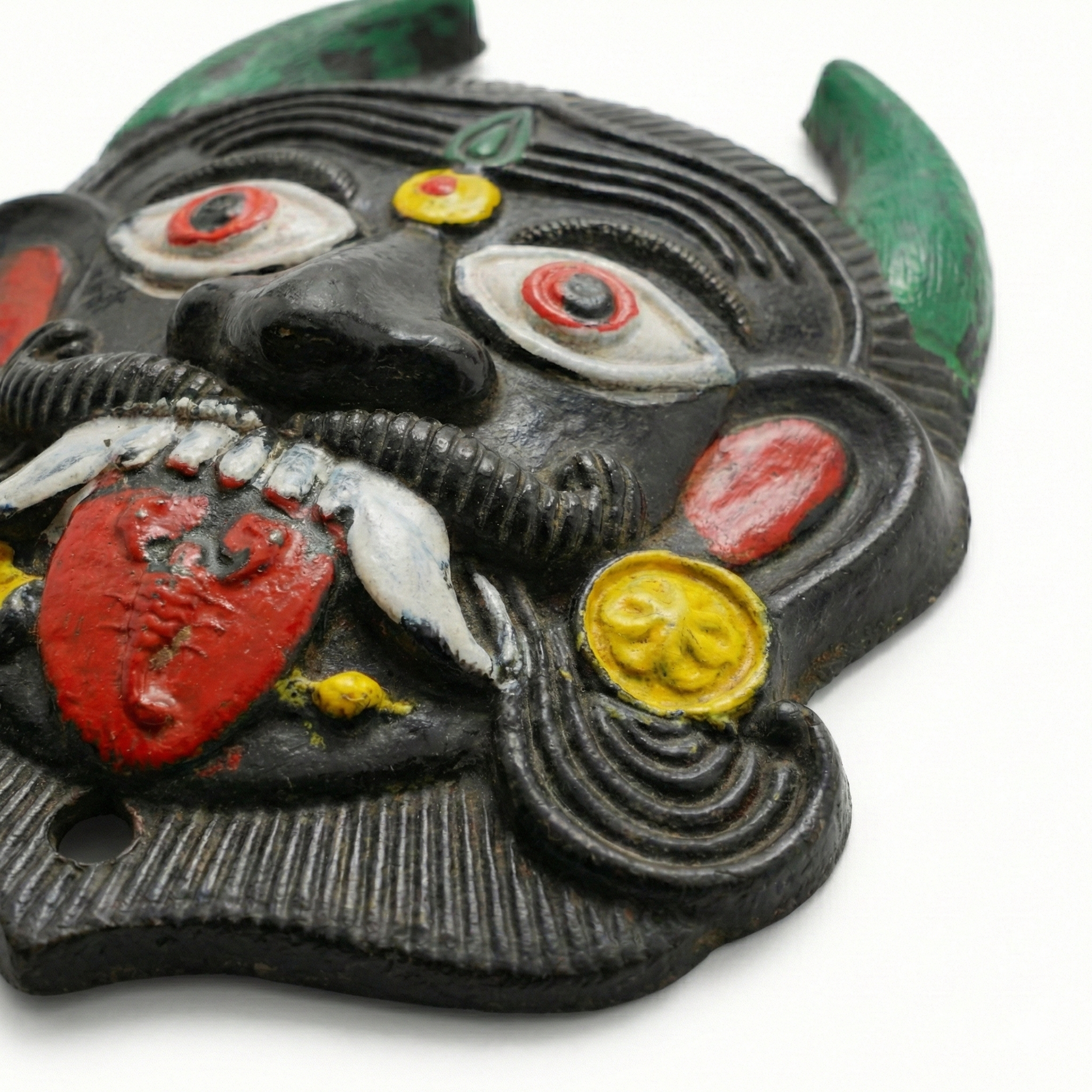 El pequeño Palaka (rostro protector de Drishti) es una pieza tradicional que se coloca a la entrada de la casa para brindar protección energética. El Palaka actúa como un guardián simbólico, alejando el drishti (mal de ojo), las energías negativas y las influencias desfavorables, preservando así la integridad del hogar sagrado.